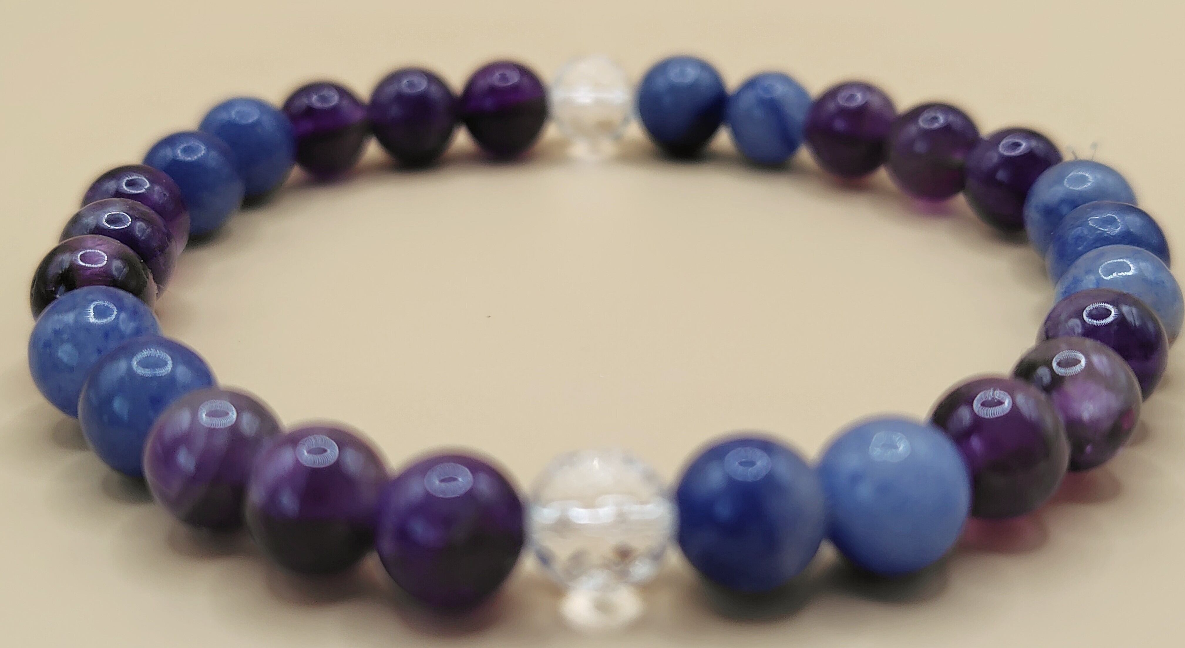 このアメジストとブルークォーツブレスレットは、コミュニケーション能力を高め、恋愛成就をサポートしてくれるパワーストーンアクセサリーです。アメジストは心を落ち着かせ、ブルークォーツはコミュニケーション能力を高めてくれると言われています。両方の石を組み合わせることで、恋愛において自信を持ち、相手とのコミュニケーションがスムーズになるかもしれません。