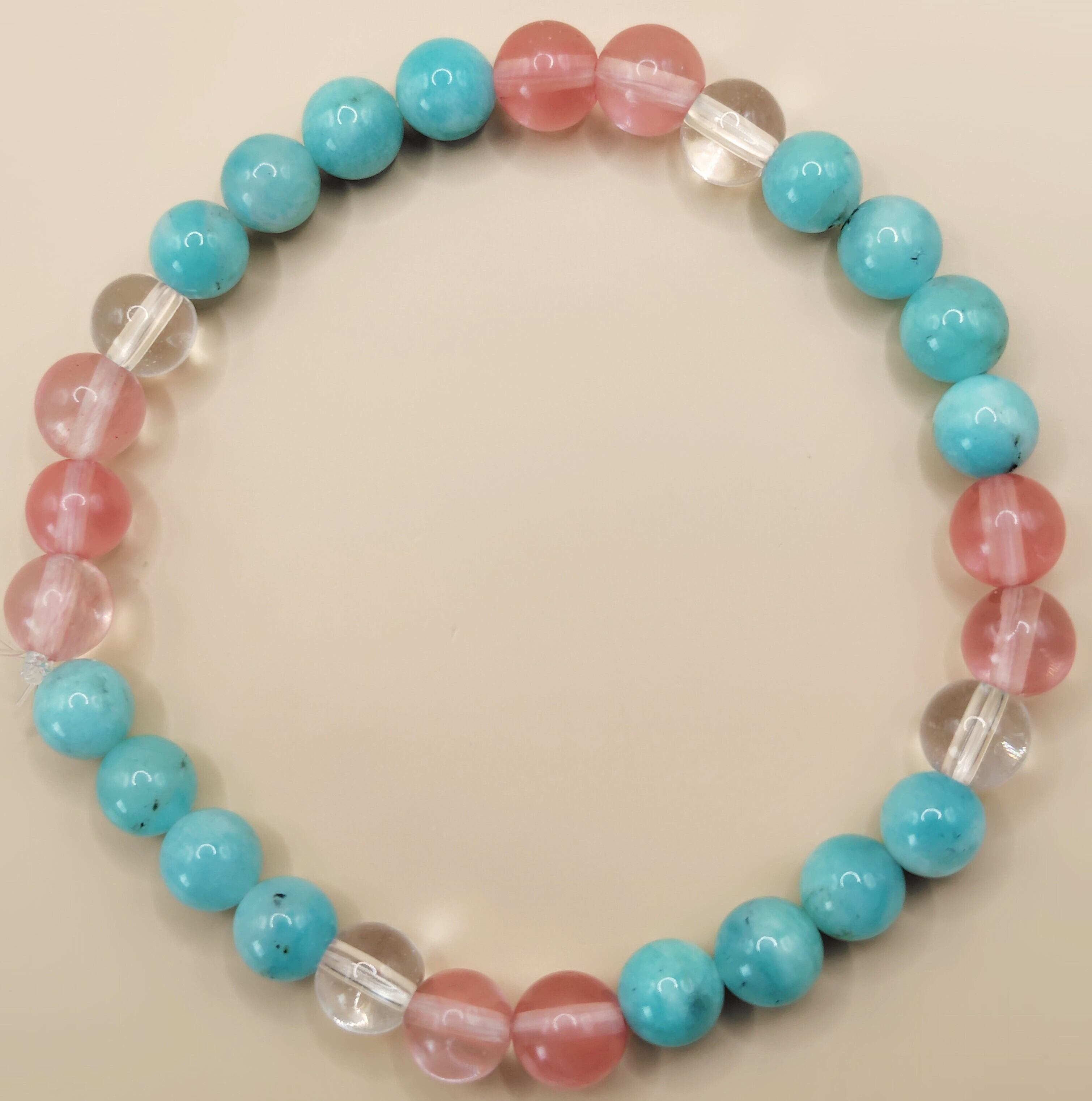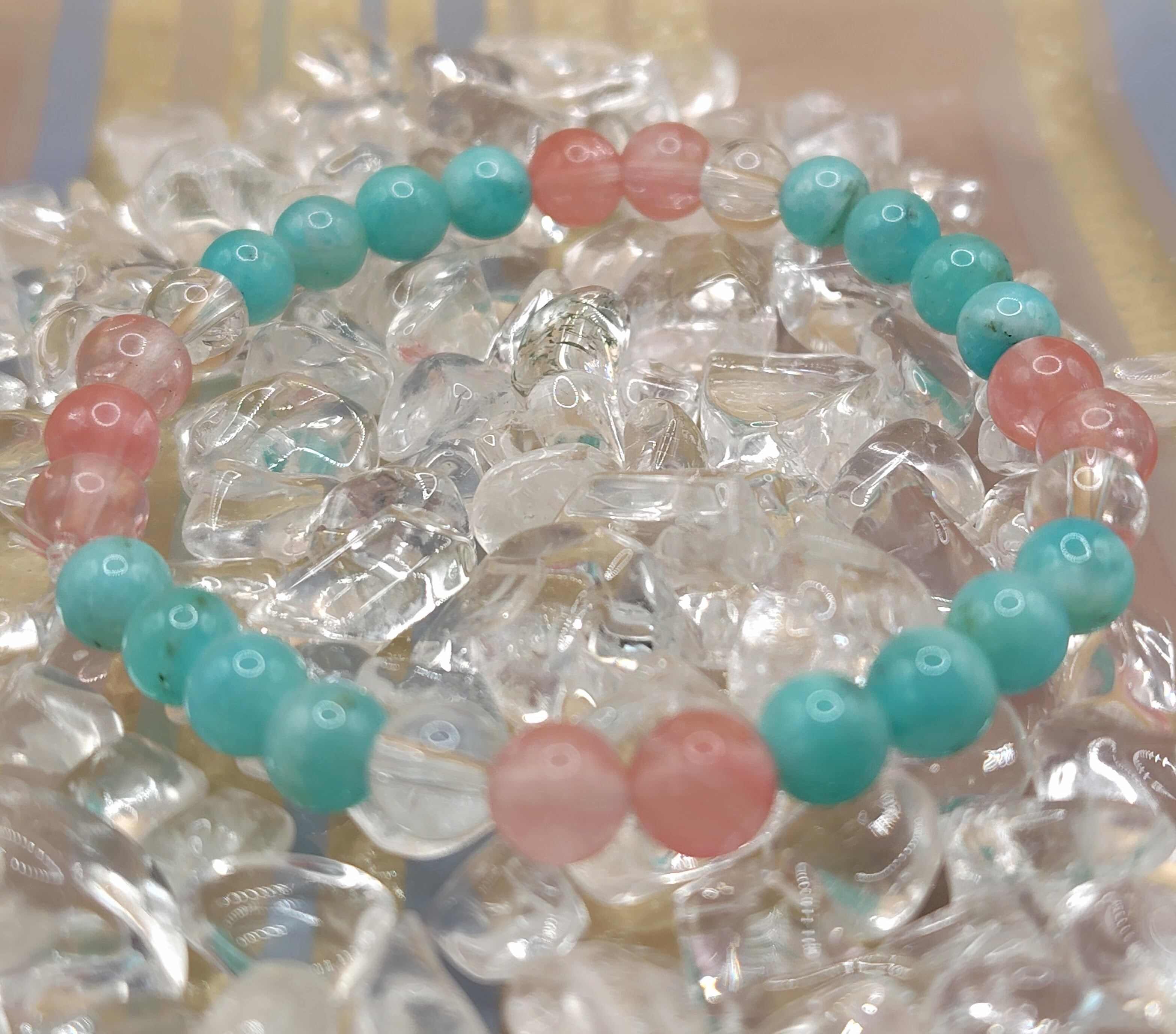 <アマゾナイトとチェリークォーツのパワーが詰まったブレスレット。アマゾナイトは心を癒し、チェリークォーツは願望達成をサポートする力を持つと言われています。身に着けることで、穏やかな気持ちを保ちながら目標に向かって進むサポートをしてくれます。>