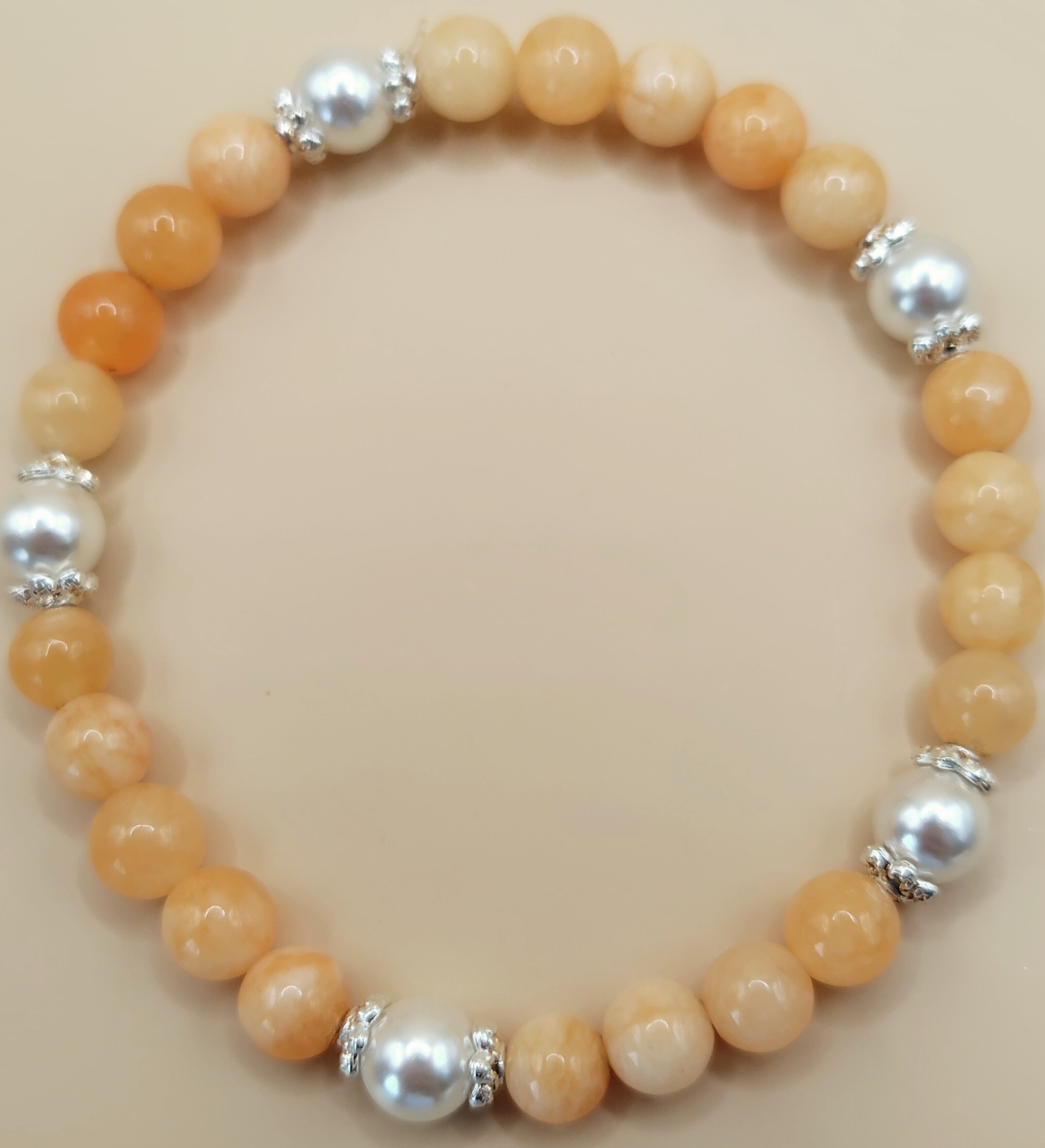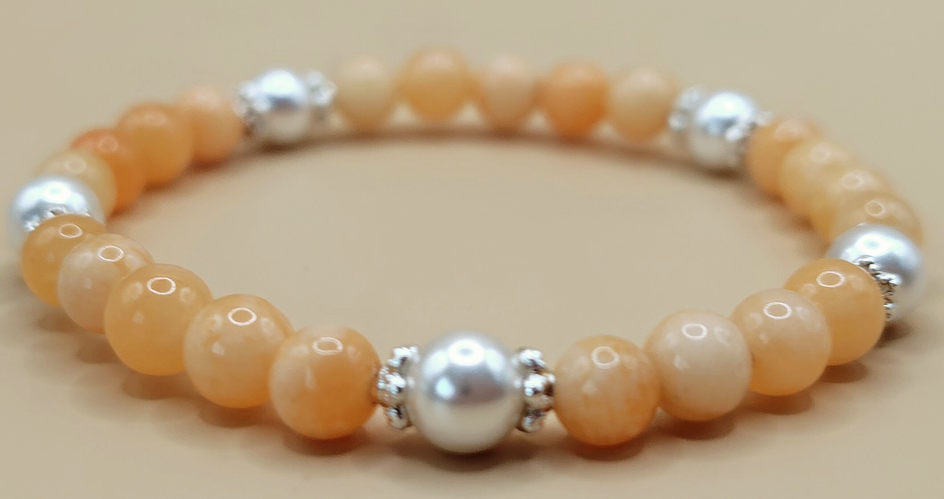 オレンジジェードとパールが輝く、心身をパワーアップさせるブレスレットが登場しました。オレンジジェードは、パワーを高め、気持ちを前向きにしてくれると言われています。一方のパールは、純粋さや調和を象徴し、自身の成長を促すパワーを持っています。このブレスレットは、日常の疲れやストレスから心身を守り、ポジティブなエネルギーを与えてくれます。